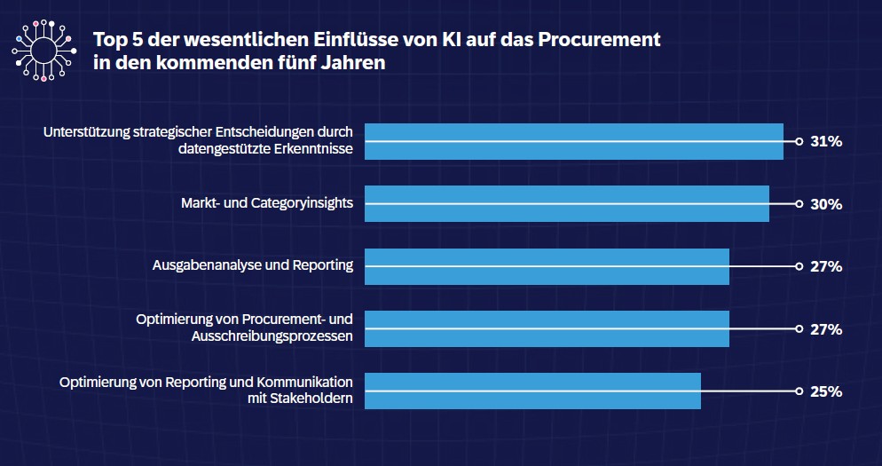 Künstliche Intelligenz kann Führungskräfte im Procurement in vielerlei Hinsicht unterstützen: 31 Prozent der Befragten erwarten den größten Einfluss innerhalb der nächsten fünf Jahre in der strategischen Entscheidungsfindung auf Basis von datengestützten Insights.