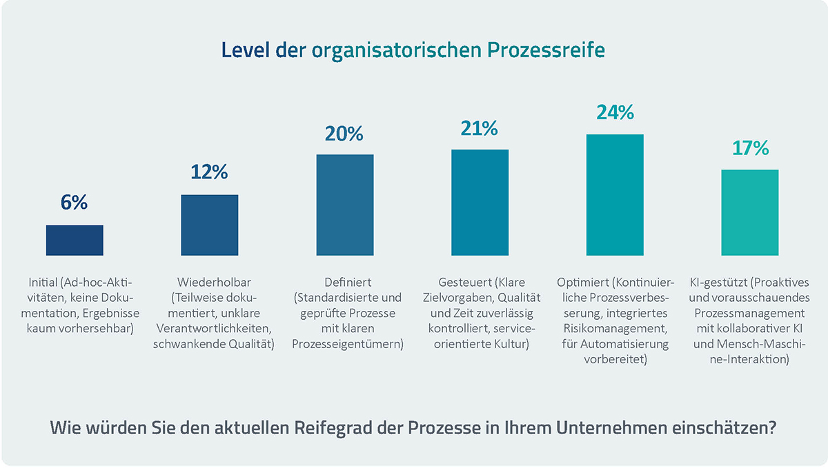 Ein moderner Prozess endet nicht an der Grenze eines ERP- oder CRM-Systems. Über technische Integrationen und standardisierte API-Programmierschnittstellen (Application Programming Interface) können unterschiedliche Softwareanwendungen miteinander kommunizieren, Daten austauschen und gemeinsame Funktionen nutzen. Auf diese Weise entstehen durchgängige Abläufe, die interne und externe Partner einbinden – vom Lieferantenmanagement über den Kundensupport bis zur revisionssicheren Dokumentation. Bislang nutzen jedoch lediglich 29 Prozent der befragten Organisationen eine integrierte Prozessmanagement-Suite. Alle anderen arbeiten mit Einzellösungen, die wenig bis gar nicht miteinander kommunizieren. Das erschwert nicht nur die Datennutzung, sondern behindert auch die Einführung neuer Technologien. Unternehmen, die eine modulare, integrierte Architektur nutzen, können ihre Prozesse hingegen flexibel erweitern, KI nahtlos einbinden und Innovationen schneller umsetzen.