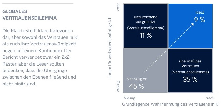 Die zentrale Erkenntnis der Studie betitelt SAS mit dem Begriff „Vertrauensdilemma“. Während international 35 Prozent der Unternehmen intelligenten Systemen vertrauen, die nicht wirklich zuverlässig oder ausreichend geprüft sind, bleibt das Potential von vertrauenswürdiger, gut kontrollierter Künstlicher Intelligenz oft ungenutzt. Ähnliche Werte zeigen sich auch in deutschen Unternehmen. Eine Matrix aus der Studie ordnet Unternehmen in vier Quadranten ein – je nachdem, wie sehr sie ihren intelligenten Systemen vertrauen und wie vertrauenswürdig diese Systeme tatsächlich sind. Auf der einen Achse steht das wahrgenommene Vertrauen in Künstliche Intelligenz, auf der anderen die objektive Vertrauenswürdigkeit der eingesetzten Lösungen.